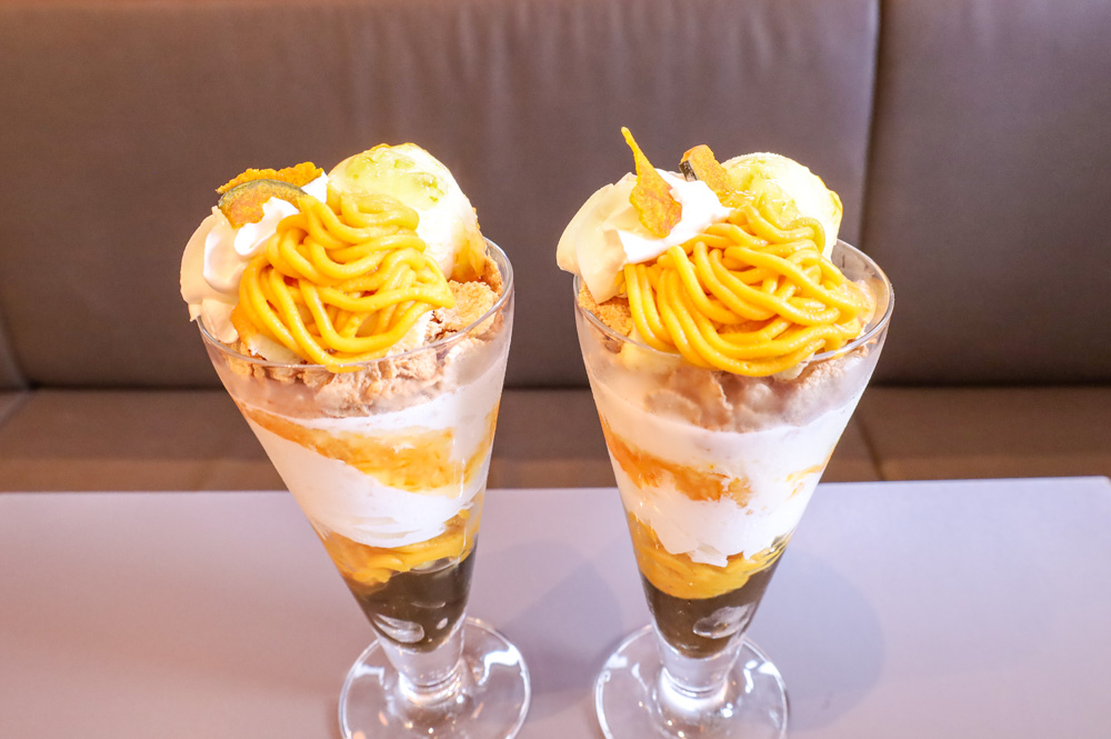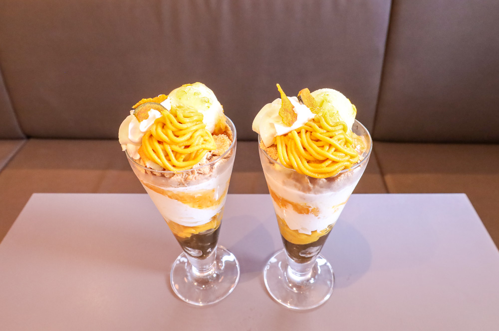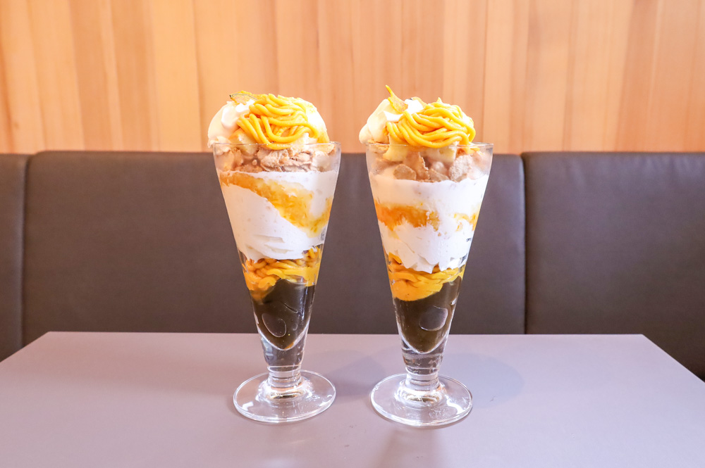 かぼちゃのモンブランパフェ(1,490円)は主役となるのは、北海道産のえびすかぼちゃ。その濃厚な甘みを生かしたモンブランクリームは、口に入れた瞬間にふんわりと広がる自然な甘さが魅力です。