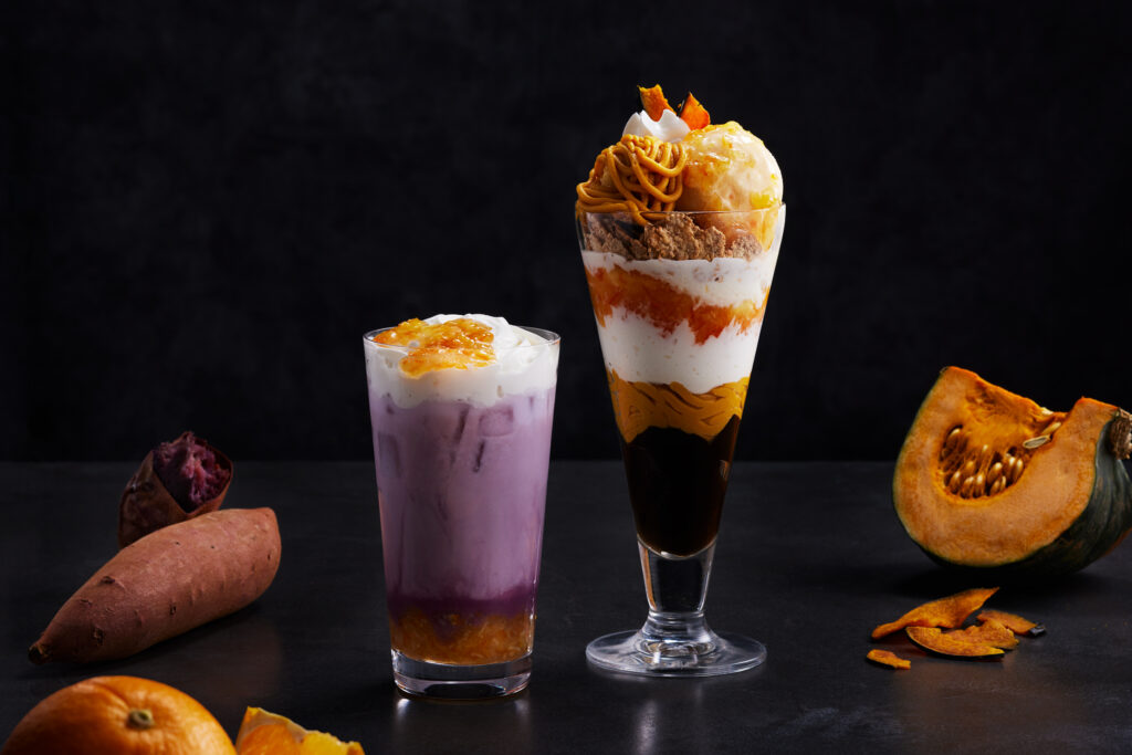 2025年9月9日(火)から10月31日(金)までの期間限定で販売されているのは、毎年人気を集める「かぼちゃのモンブランパフェ」と、新作の季節限定ドリンク「紫いもスイートラテ」。