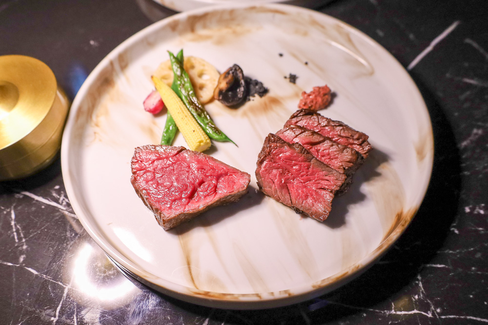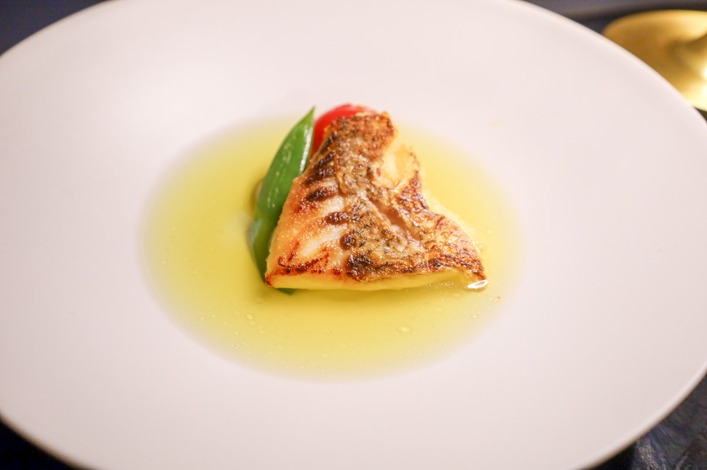 続く一品は、「季節野菜と真鯛のスープ」。和出汁を目の前で注いで仕上げてくれるライブパフォーマンス付きで、立ち上る香りが食欲を刺激します。出汁の優しい旨味と真鯛の上品な甘さが重なり合い、身体に染み渡るような一皿に。