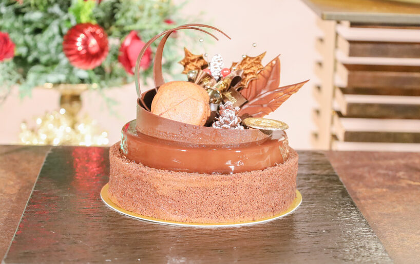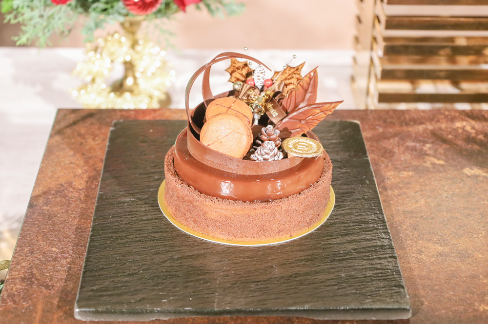トップに飾られた繊細なチョコレート細工は、佐藤シェフの技術を象徴する存在。華美すぎず、しかし確かな存在感を放ち、ホリデーシーズンの食卓をスタイリッシュに演出してくれる。