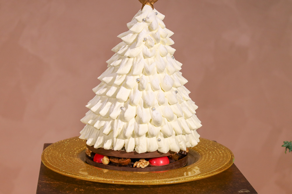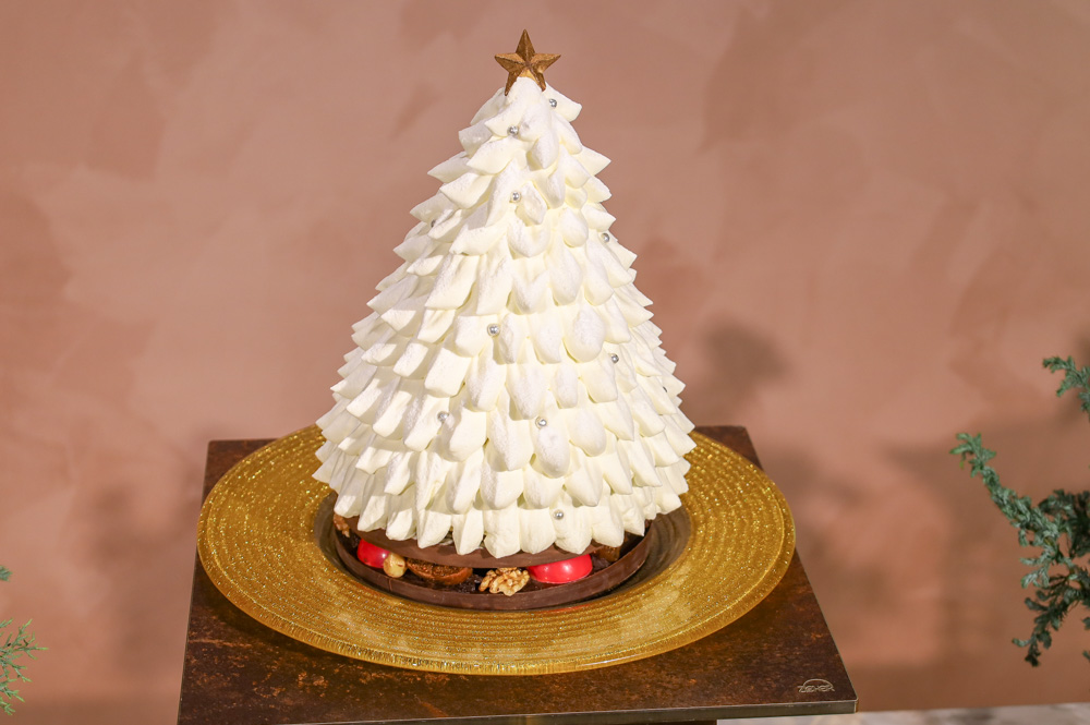 ツリー形のケーキは割れやすいイメージがあるが、こちらは温めたナイフを使うことで美しくカットできる。特別な日の演出に相応しい、気品と遊び心を兼ね備えた一品だ。